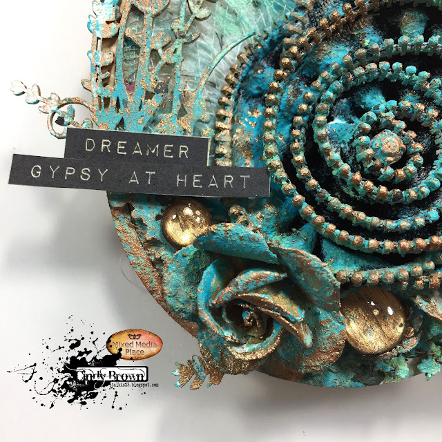 I cover all of white gesso and have fun with the new paste Patina effect of Finnabair.